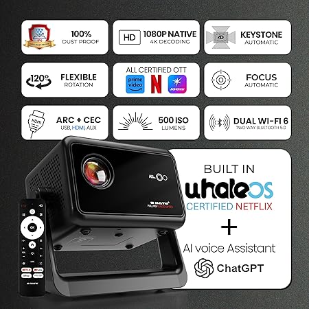 - 【CERTIFIED – CERTIFIED – CERTIFIED】 : WideVine L1 Certified. Certified Operating System Whale OS on Android 13. Certified Apps – Yes all Apps including Netflix, Prime, Zee, Sonly Hotstar are all certified to display content in Full HD. All video of 1080p at 60 FPS and compatible 4K video from drive at 30 FPS. AND its not over, Duster 5X Pro is completely DUST FREE with SEALED OPTICAL ENGINE. Hassle free screen mirroring with dedicated apps that works seamless. App store provides for TWO live TV to choose from (Whale TV+ & MovieARK) having 100s of free Live TV Channels of India and abroad without any registration or subscription.