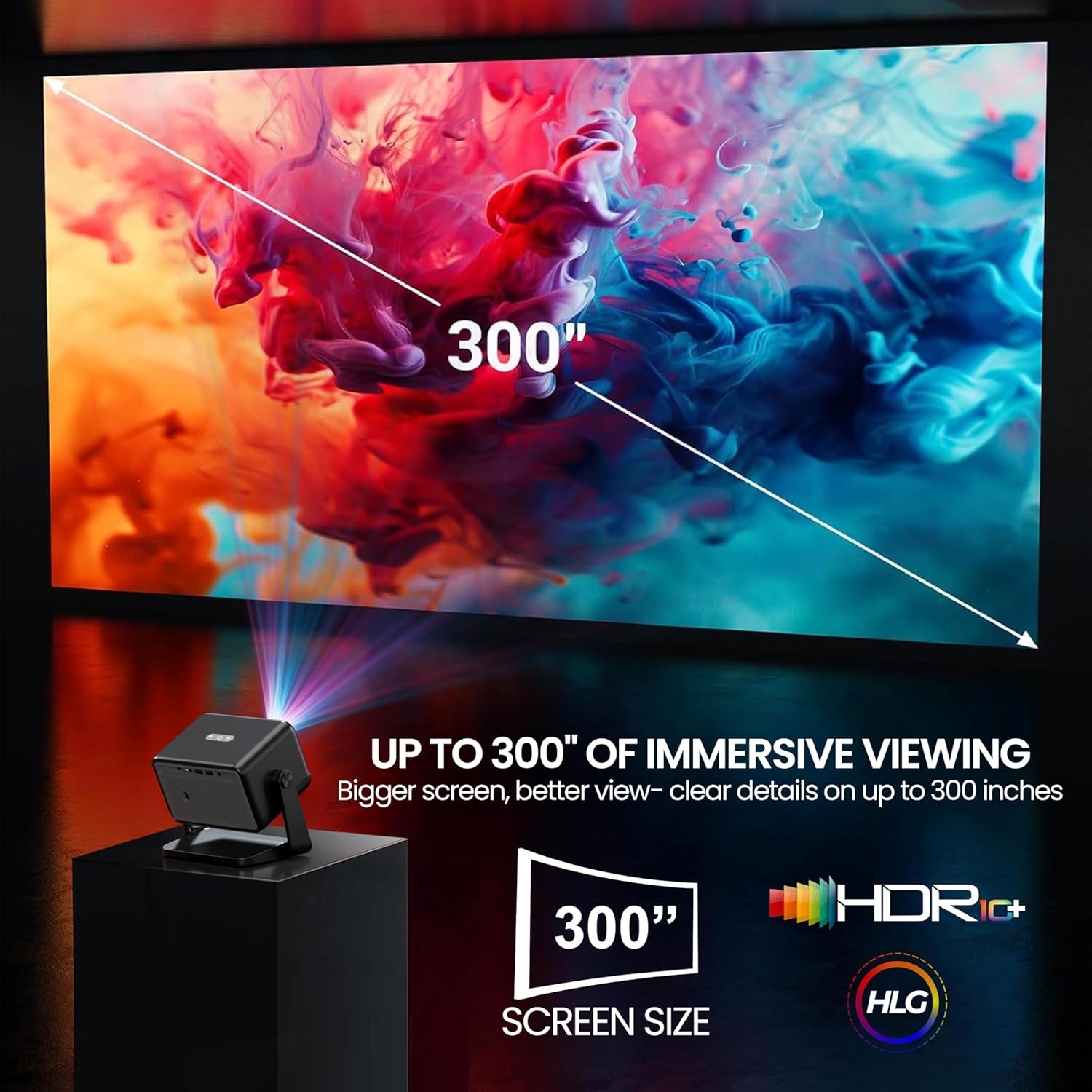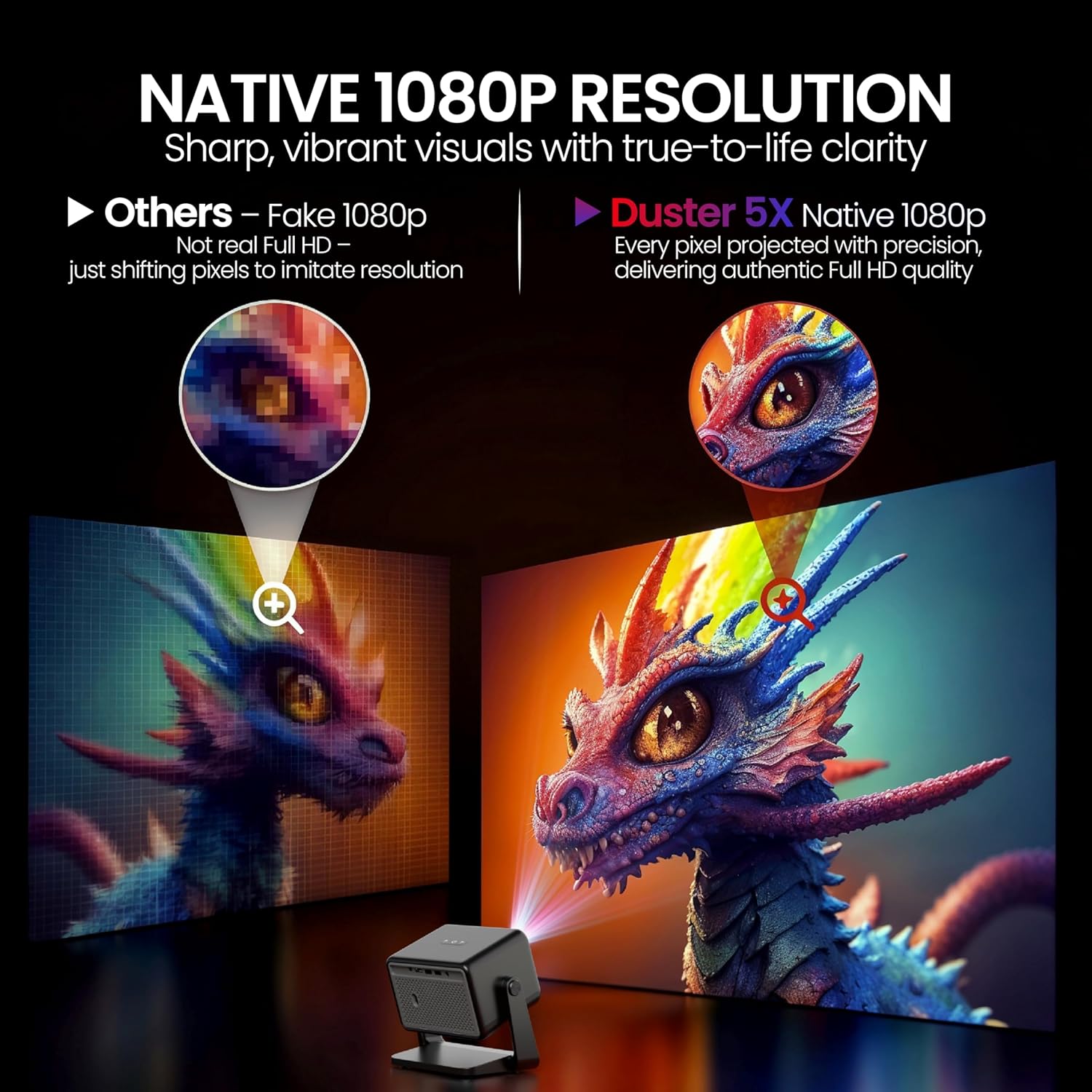 - 【Native 1080p | 5X Brighter | 4K HDR support | Fully Auomatic】 : Small is the new BIG, the Duster 5X Pro 2025 model in stunning mirror Black is a visual Marvel with 1080p Native , HDR + HLG and 5X brighter at 500 ISO Lumens equivalent or better than chinese brands claimed but unverifiable 14,000 lumens. The 6000 : 1 Contrast delivers a visual Feast on Massive 300″ (762cm)